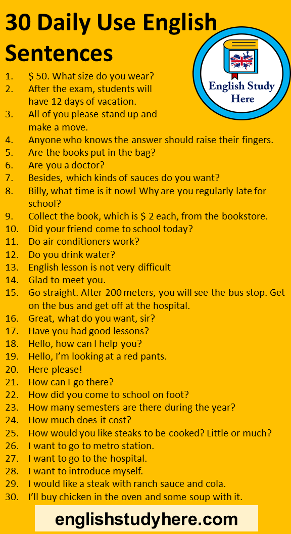 Rather, daily used english words are very simple and easy to understand as well as speak. 4.those who have not completed their homework, please stand up! Rather, daily used english words are very simple and easy to understand as well as speak. 5.todd, where's the piece of chalk? 16.11.2021 · list of daily use english sentences. 16.11.2021 · everybody makes a straight line. Please note down tomorrow's homework. Could you stay away from my stuff? Come on, everybody, to the canteen. 2.this is dominguez 3.this is my home address. Daily use english sentences lesson 8.